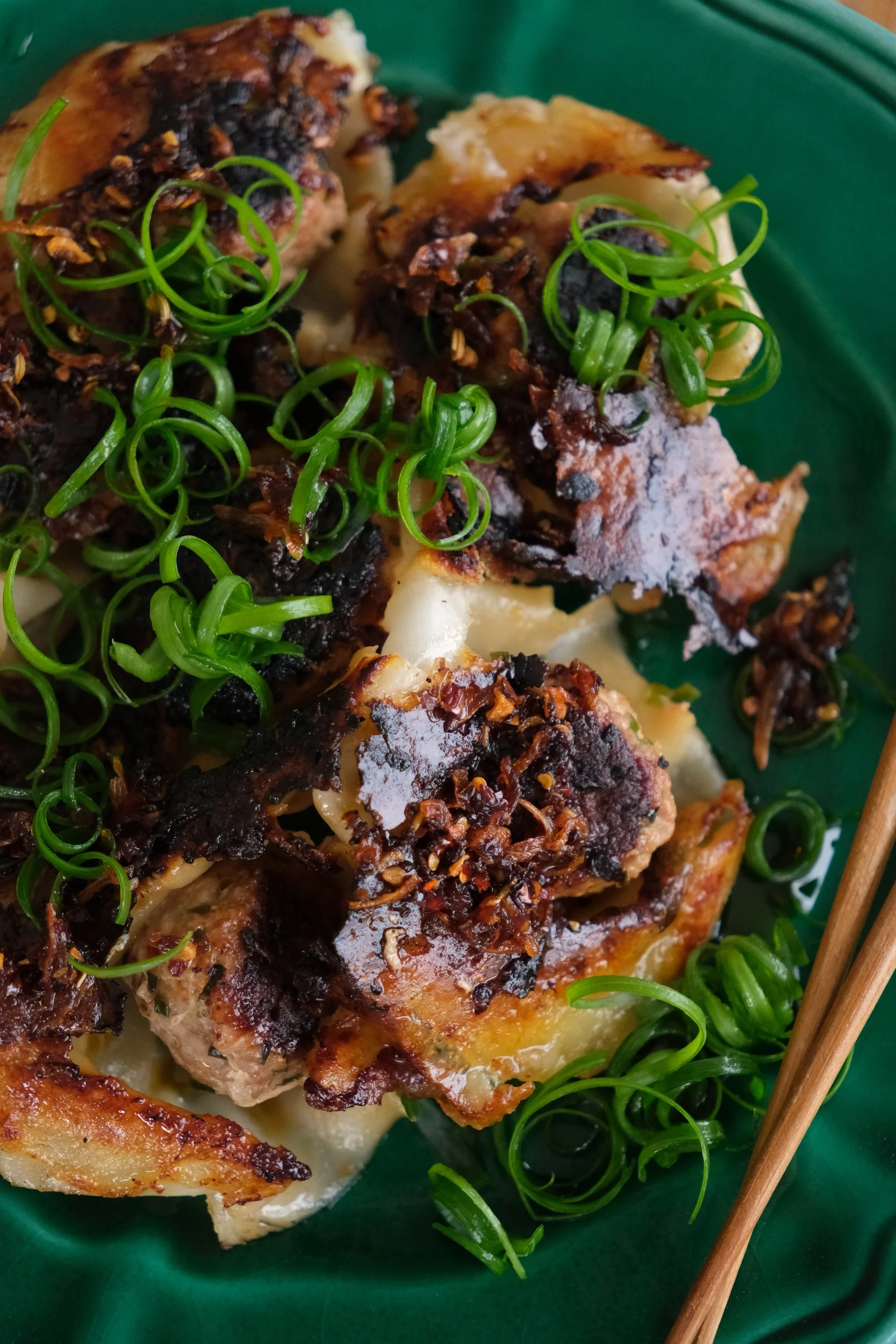 To finish, I topped mine with toasted sesame seeds, the green parts of shallots and a generous spoonful of Six-Eyed Scorpion Chilli Oil, which was absolutely delicious. It added the perfect amount of heat and richness and pulled the whole thing together. These are best served straight away, while the bottom is still nice and crisp.